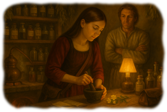 He led her into his stillroom. Shelves lined the wall, crowded with glass jars and stoppered vialsâsome clear, others tinted amber or green. Each bore a neat label in careful script: Tinctura Hyperici, Unguentum Valerianae, Spiritus Menthae. Bundles of dried herbs hung from the rafters, their scents mingling in the airârosemary, sage, and foxglove among them. A mortar and pestle sat on the counter, its surface dusted with traces of crushed petals and powdered bark.