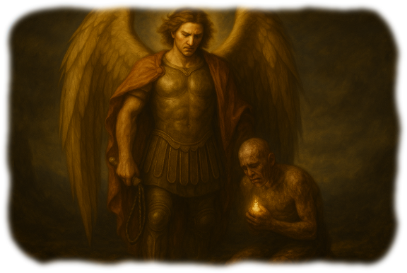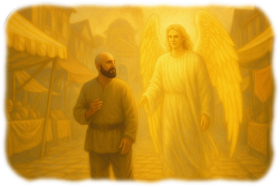 A Shining One stood before him. He did not so much arrive as dawn. He cast no lightâhe was light: living, searching, unblinking. His wings spread vast and gold, the hue of morning breaking through the clouds. His hair shimmered like sunlight caught in water. His eyes burnedânot with heat, but with comprehension.