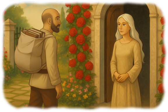 Seeker climbed the marble steps and knocked softly. The door opened, and a maiden of radiant purity stood before himâher hair the color of silvered light, her face untouched by time, her eyes deep and still as wisdom itself.