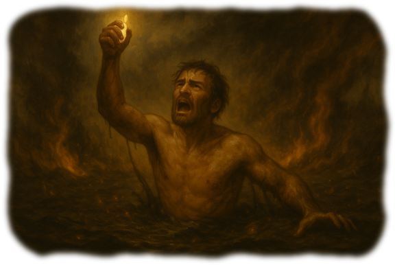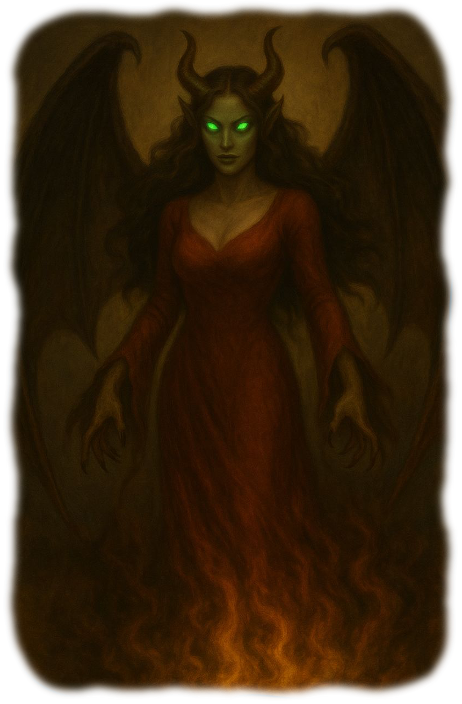The light around her shuddered and broke. Ragged wings tore from her back, her skin sagged into withered folds, and horns curled from her brow. Yet her eyesâthose unmistakable green eyesâburned hotter now, twin flames of Hell. With a laugh sharp as iron, she flung Seekerâs ring into the scalding mire, watching with delight as it vanished beneath the bubbling surface.