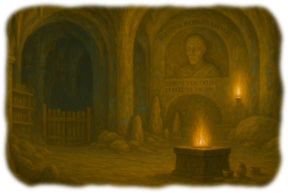The Interpreter led him into a quiet parlor and bade him set down his burden. Seeker obeyed, unshouldering the pack and laying the books upon a low table. The Interpreter opened one and turned its pages slowly, his fingers tracing the lines as though reading the soul of the text.