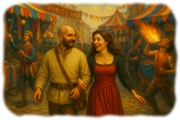 The weight of his burden slowed him through the crowded streets of the Fair. The noise pressed around himâvendors calling, wheels creaking, laughter echoing off the tents. How had he managed all this before, in the state heâd been in?