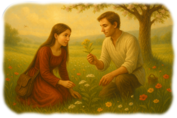 As they walked, she noticed a dense cluster of golden-yellow flowers, each with five bright petals. With his pruners, he clipped the upper stems and tied them neatly into a bundle. Then he held one leaf to the light.