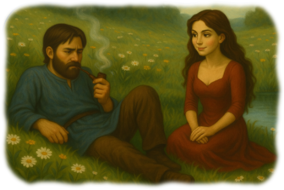 Seeker paused at his favored place on his way back from his labor. The grass lay thick and soft beneath him, wildflowers bending gently with the breeze. Here the stream slowed, gathering into a clear pool that mirrored sky and meadow alike, as if the world itself were holding its breath.