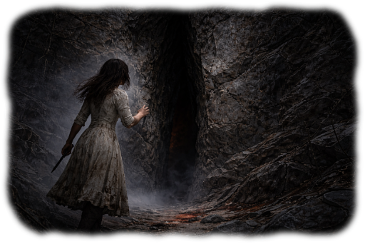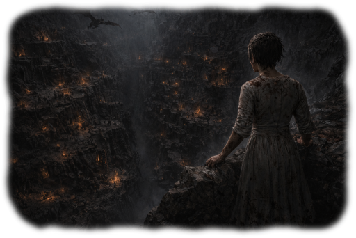 Eva rose slowly to her feet and scanned the abyss. It was as deep as the Hill of Difficulty was tall—perhaps deeper still. The trail of blood ended here. Firelight flickered below, revealing ledges and outcroppings, but the rock walls were sheer—no handholds. Perry was down there. She had no doubt. And she would find a way down.