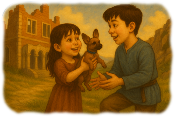 There it stood—a country house, modest yet stately.  Its whitewashed walls gleamed in the sun; their brightness softened by ivy curling in gentle green along the stone.  A golden thatched roof sloped low, as though bowing toward the meadows.  Windows latticed with leaded glass caught the light and scattered it across the grass.  Fruit trees bordered the garden, branches heavy with apples and pears, while roses clung to the fence, sweetening the air with fragrance.
