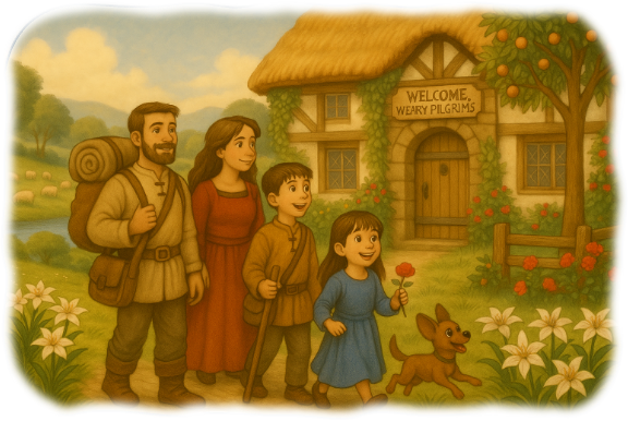 A wide oak door, darkened with age and polished by countless hands, stood before them.  Across its face were carved the words:  Welcome, weary pilgrims.