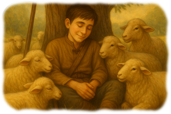 Bright sank beneath a tree, his legs quivering too hard to hold him.  He held the staff against his chest and tried to steady his breath.  Slowly, the trembling eased.  A tune slipped through his lips, soft at first, then steadier, threading through the meadow like a breeze.  One by one, the sheep wandered back, their bleating quieting.  They circled close and settled around him, wool brushing his knees, until he sat enclosed in their calm.