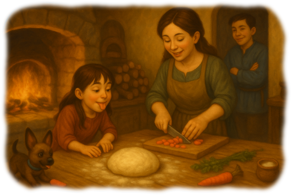 A stack of logs towered taller than she was, and when one popped into the fire she jumped—then giggled.  Dusty flour drifted in the air and settled on the table, where a lump of dough waited beneath a white cloth, rising as if it were breathing.