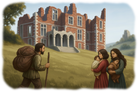 When they reached the clearing, Palace Beautiful rose before them. Its red-brick walls and pale cornerstones stood weathered and crumbling. Stairs climbed to an arched entry, where white stone columns still held beneath the weight of centuries—edges worn but unbroken. Above, the roof had long since fallen, leaving jagged teeth of masonry biting into the sky.