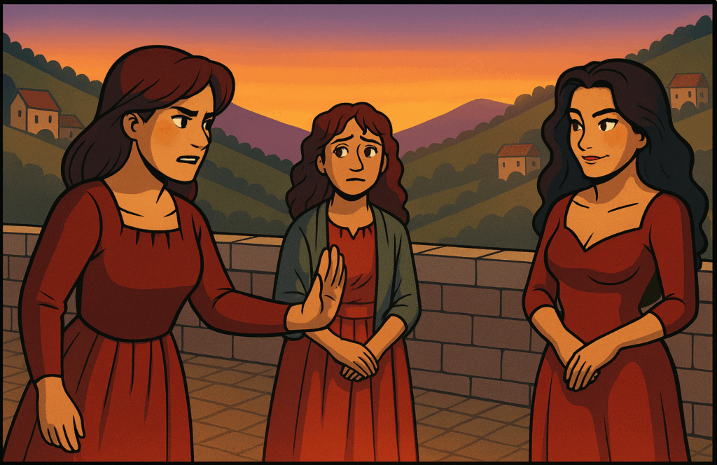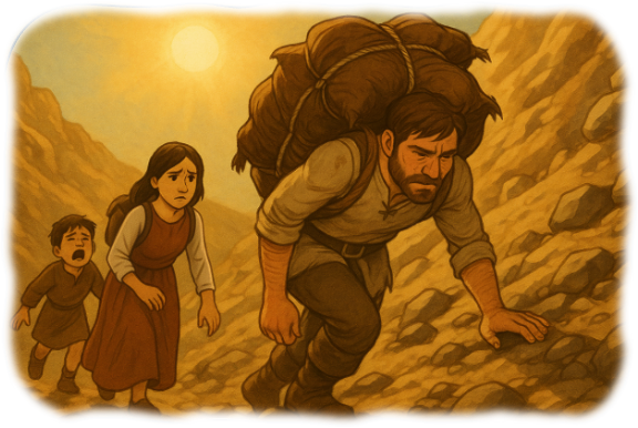 Beside the hearth stood a wide-mouthed clay jar she hadn’t noticed before—worn and chipped, holding only a few handfuls of meal—and a small clay cruse with a narrow neck, filled with golden oil. Just enough for several small loaves of bread. The hearth itself was small and plain, yet large enough to bake them. With their provisions stolen, this would sustain them only for a day, and they would need to continue on.