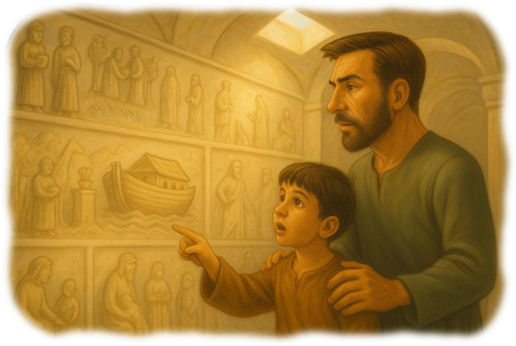 Inside lay a chamber of pure alabaster, its walls etched with stories of antiquity. Sunlight poured through the skylights, setting the stone aglow. Seeker paused before the first relief: two brothers, two altars—one piled with fruit of the field, the other with a lamb.
